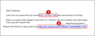 2  Tá an chuma ar an nasc go dtéann sé chuig suíomh gréasáin An Post ach má choinníonn tú cúrsóir os cionn an naisc   feicfidh tú go dtabharfadh sé chuig suíomh calaoiseach tú.